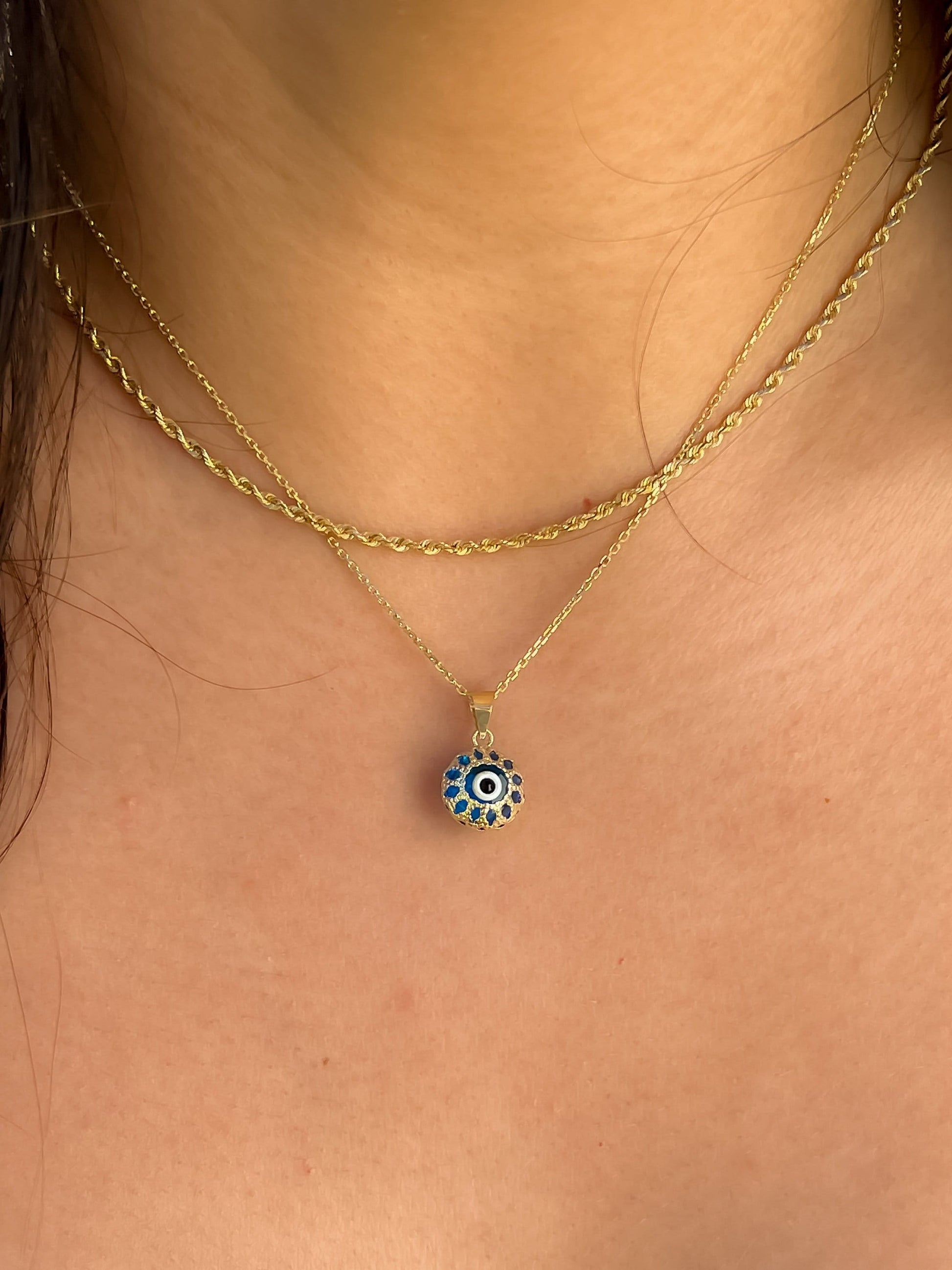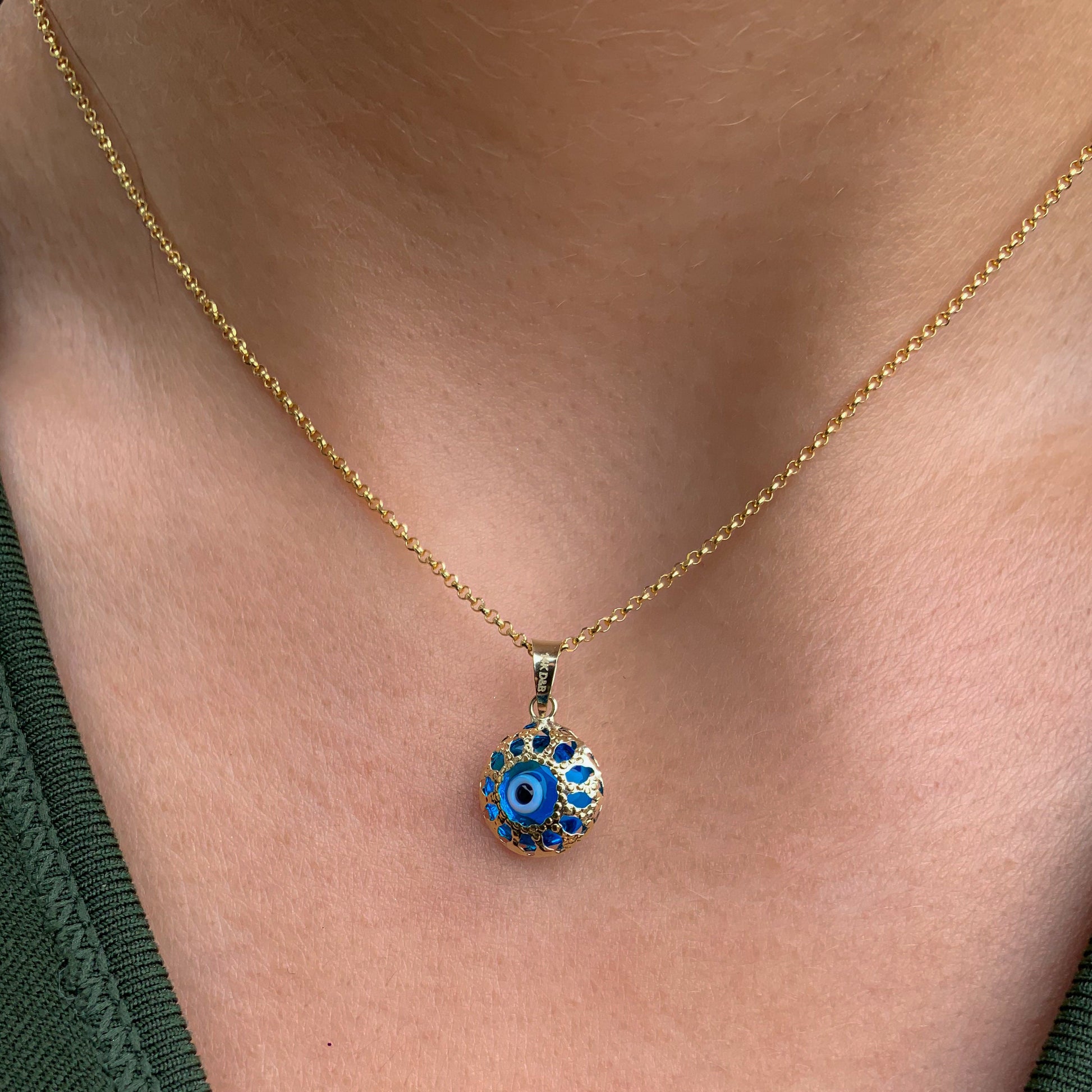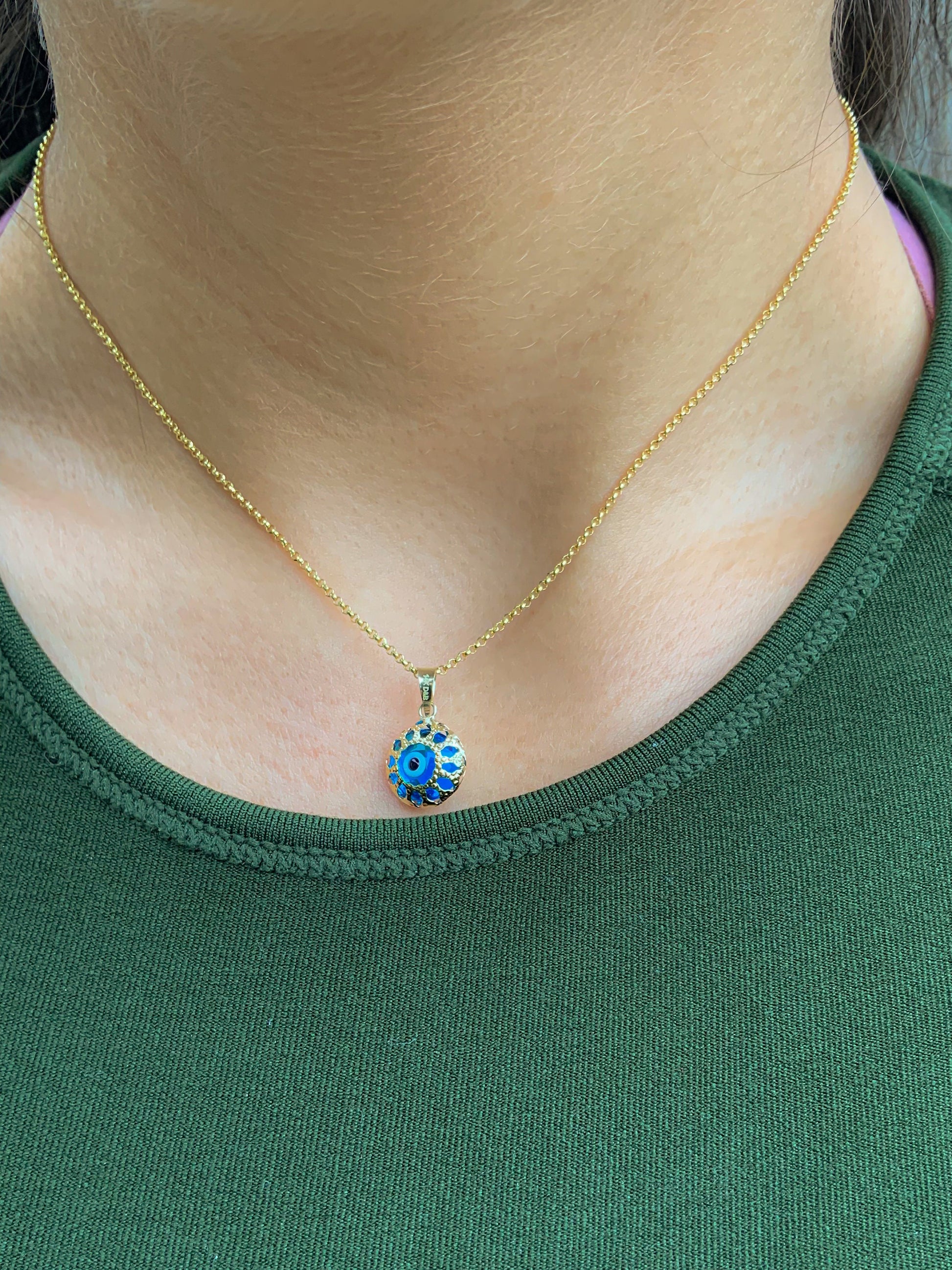 Round unique blue evil eye pendant is 14k yellow gold. Not plated or filled this real gold
