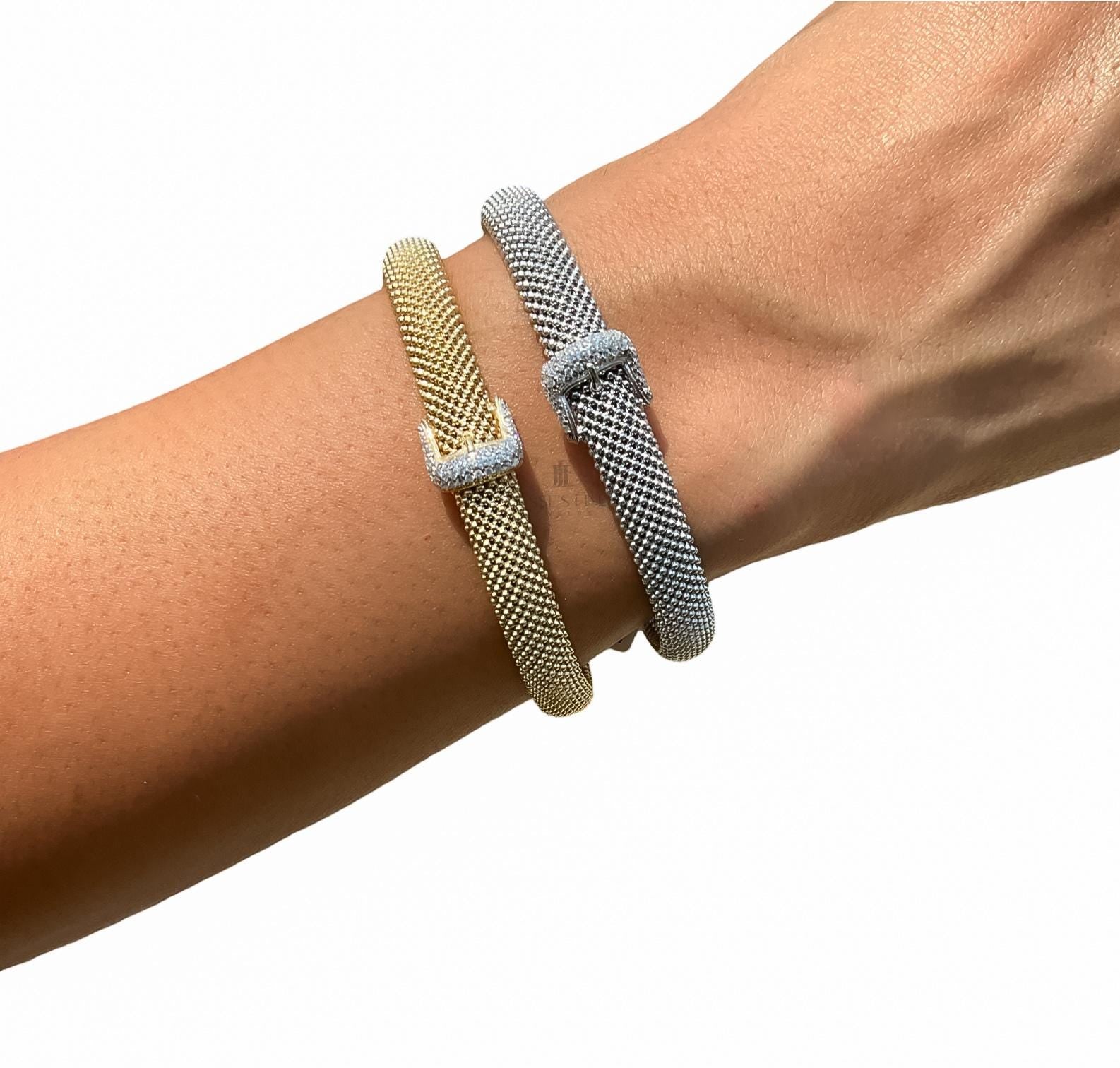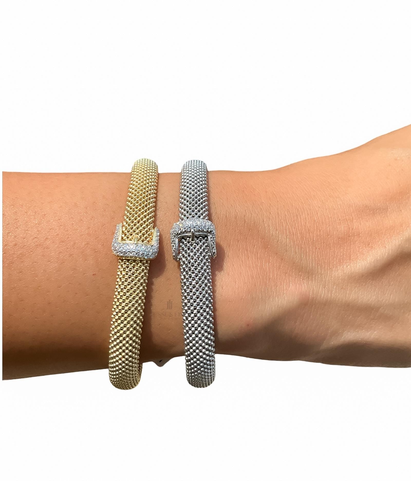 This mesh style bangle resembles a belt buckle and its adorned with cubic zicornia details