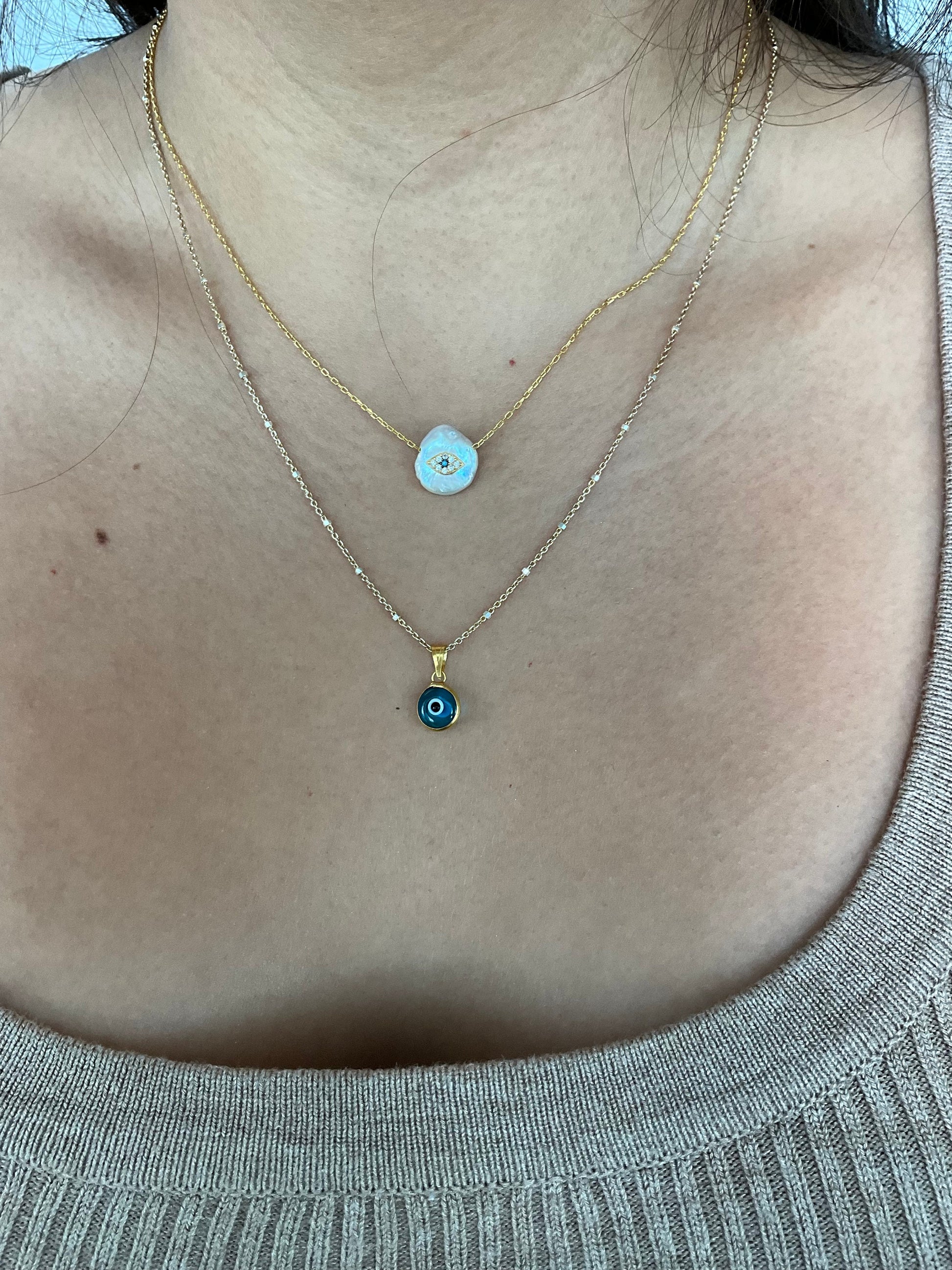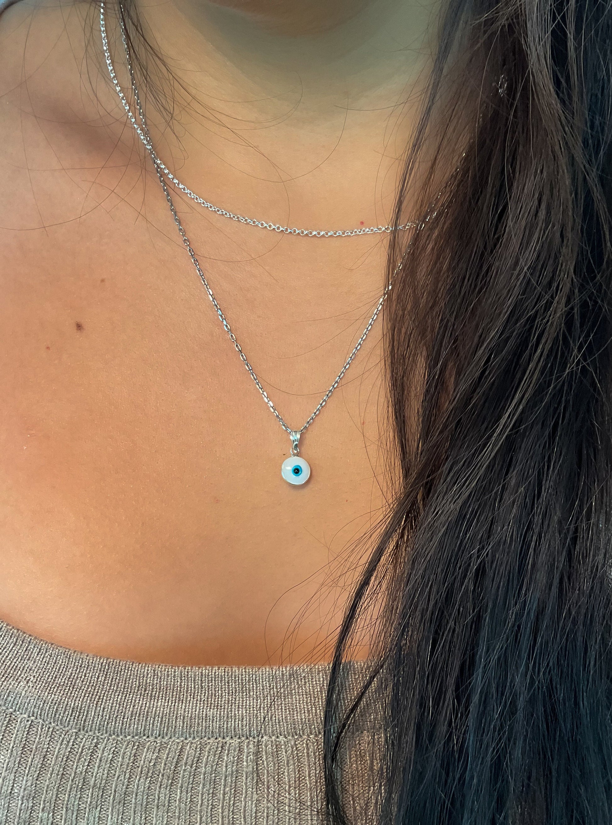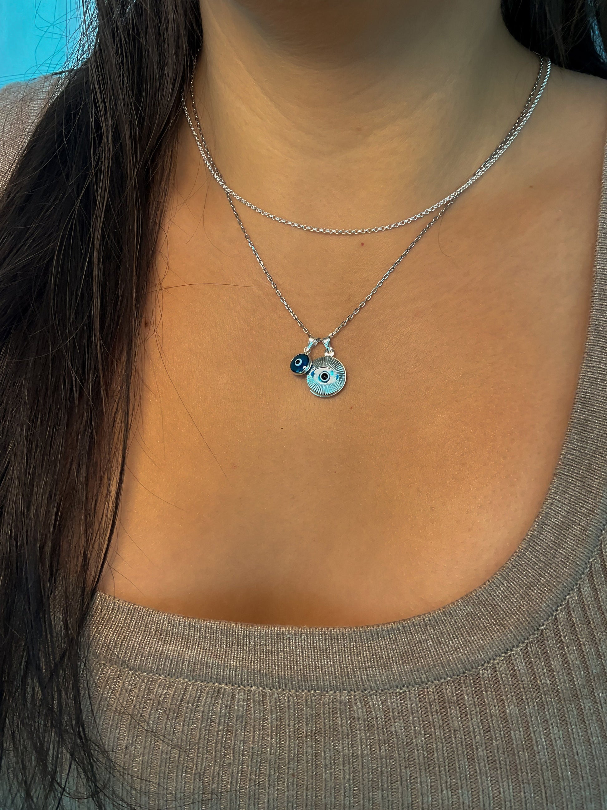 Dainty round bezel set evil eye pendant in sterling silver is the perfect size to add to your necklace