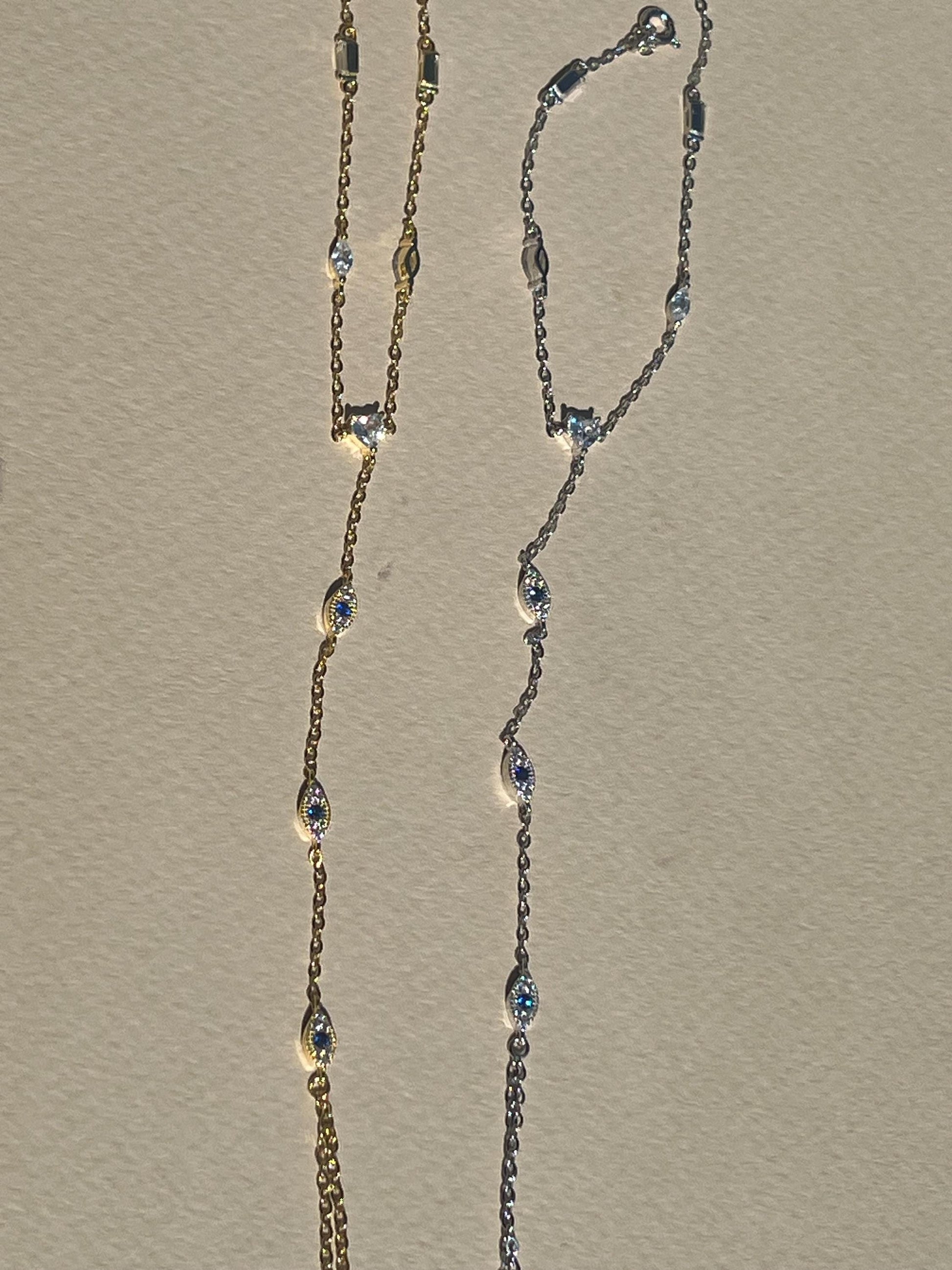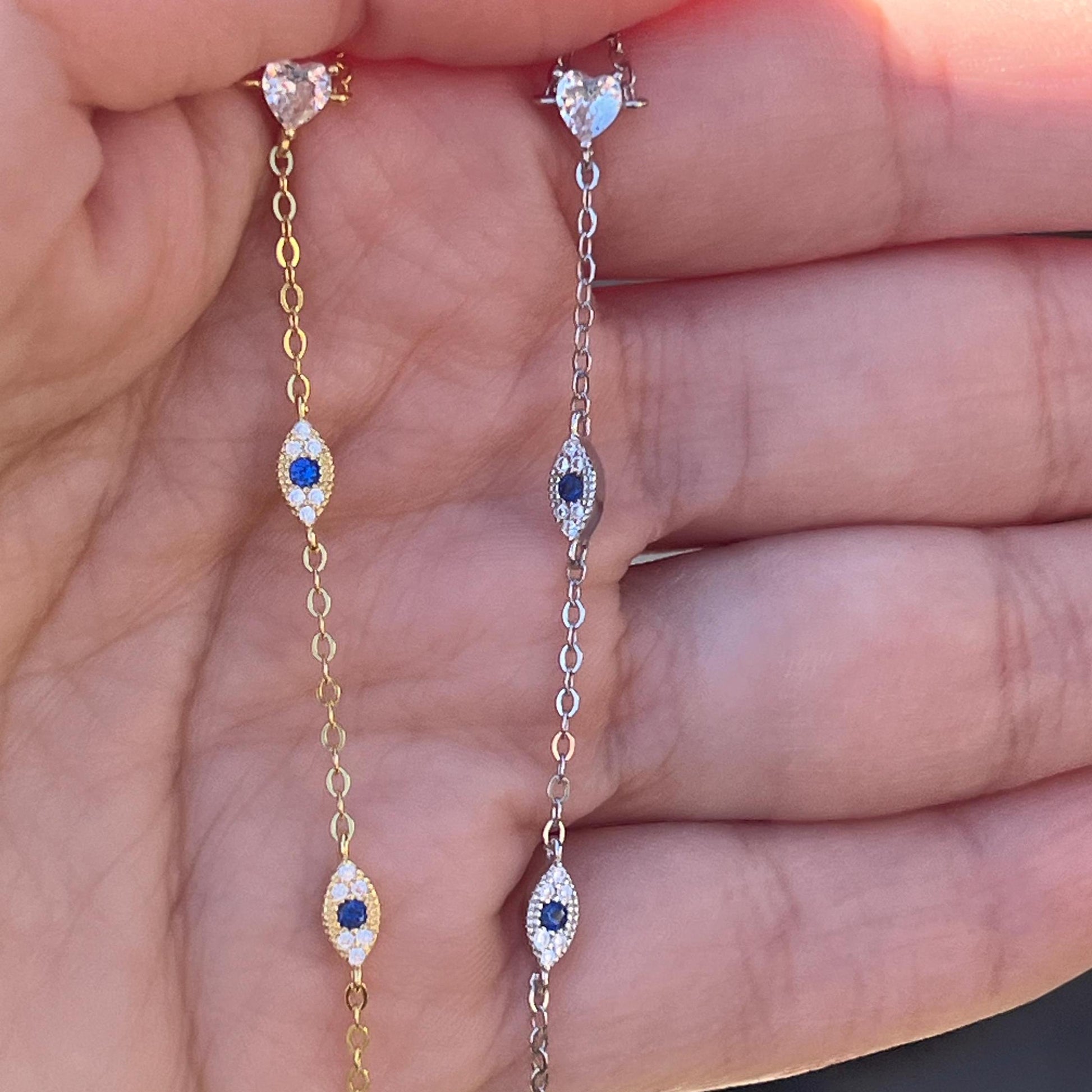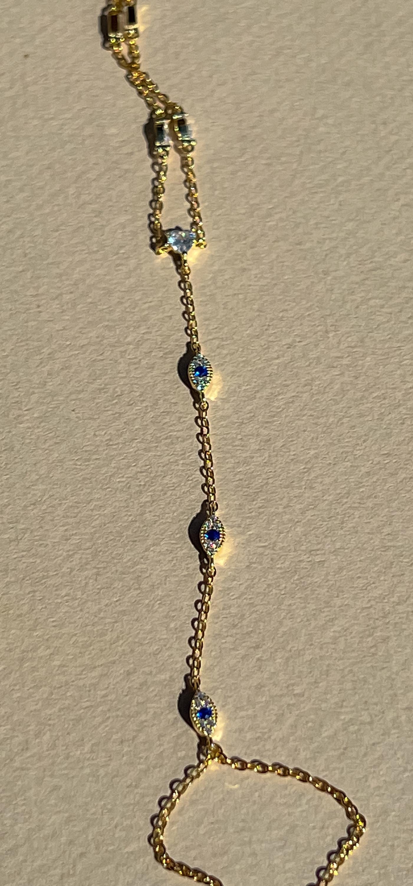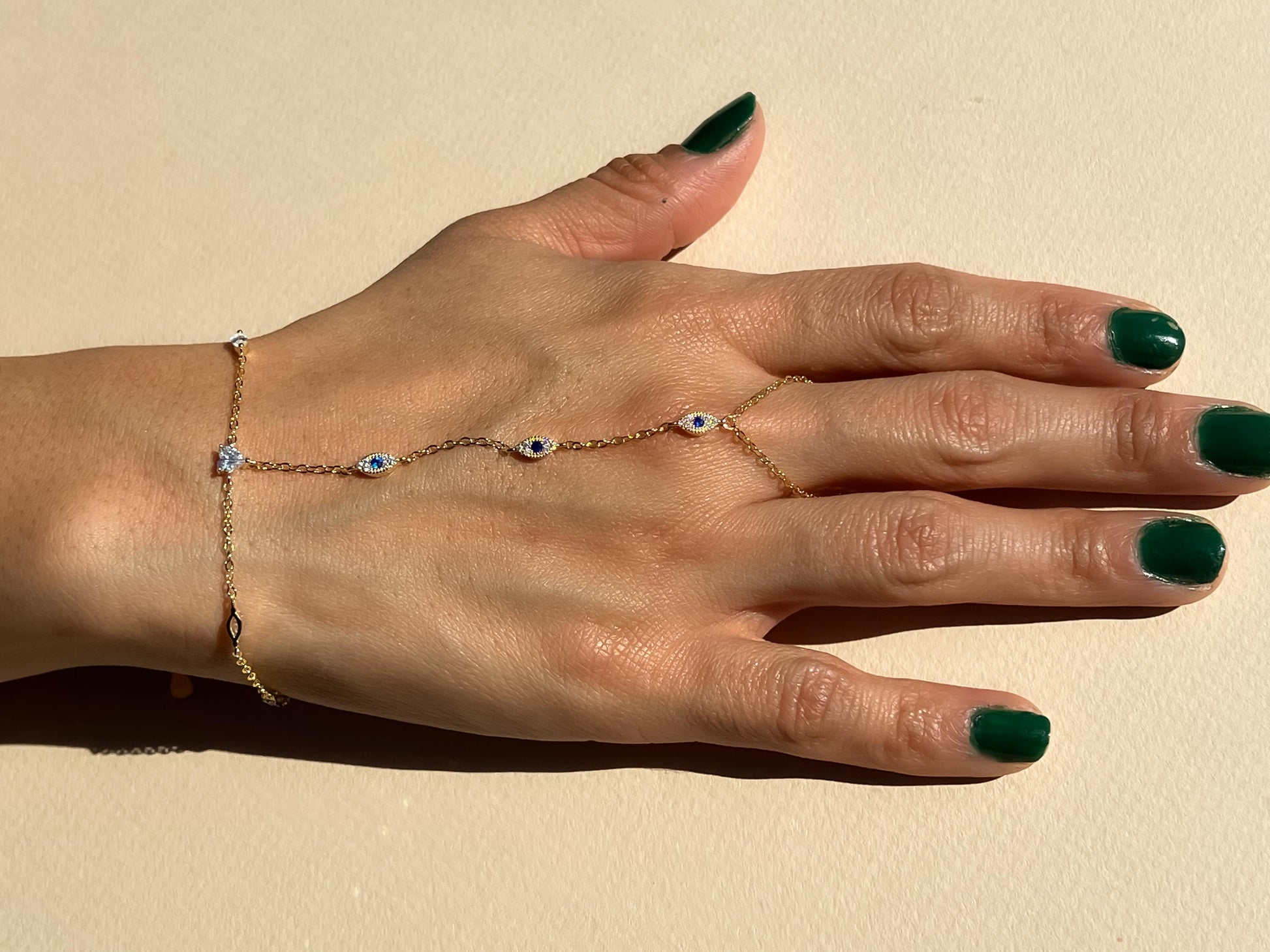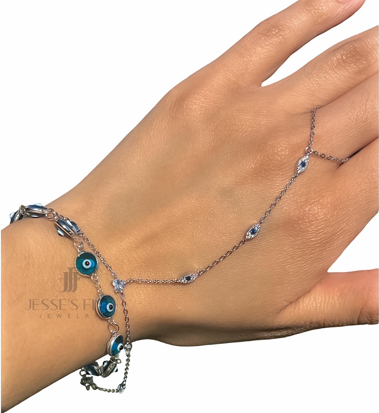 This dainty evil eye handchain comes in sterling silver or gold plated sterling silver