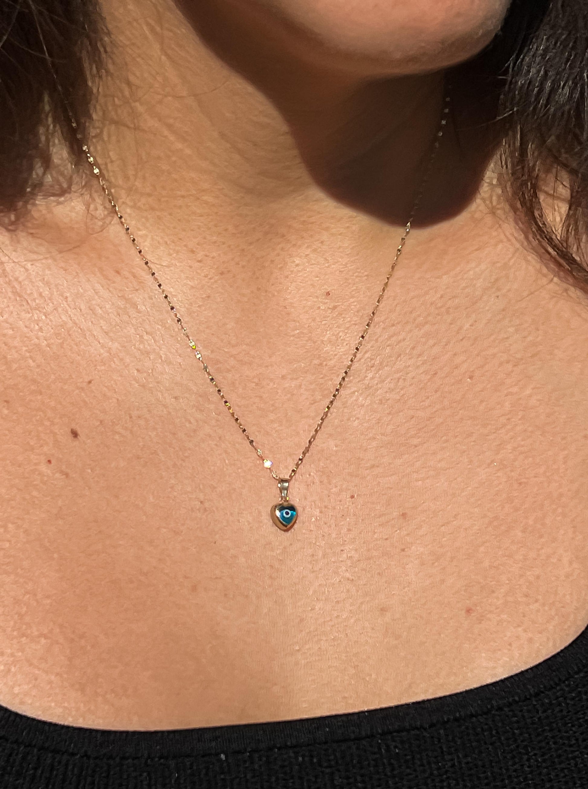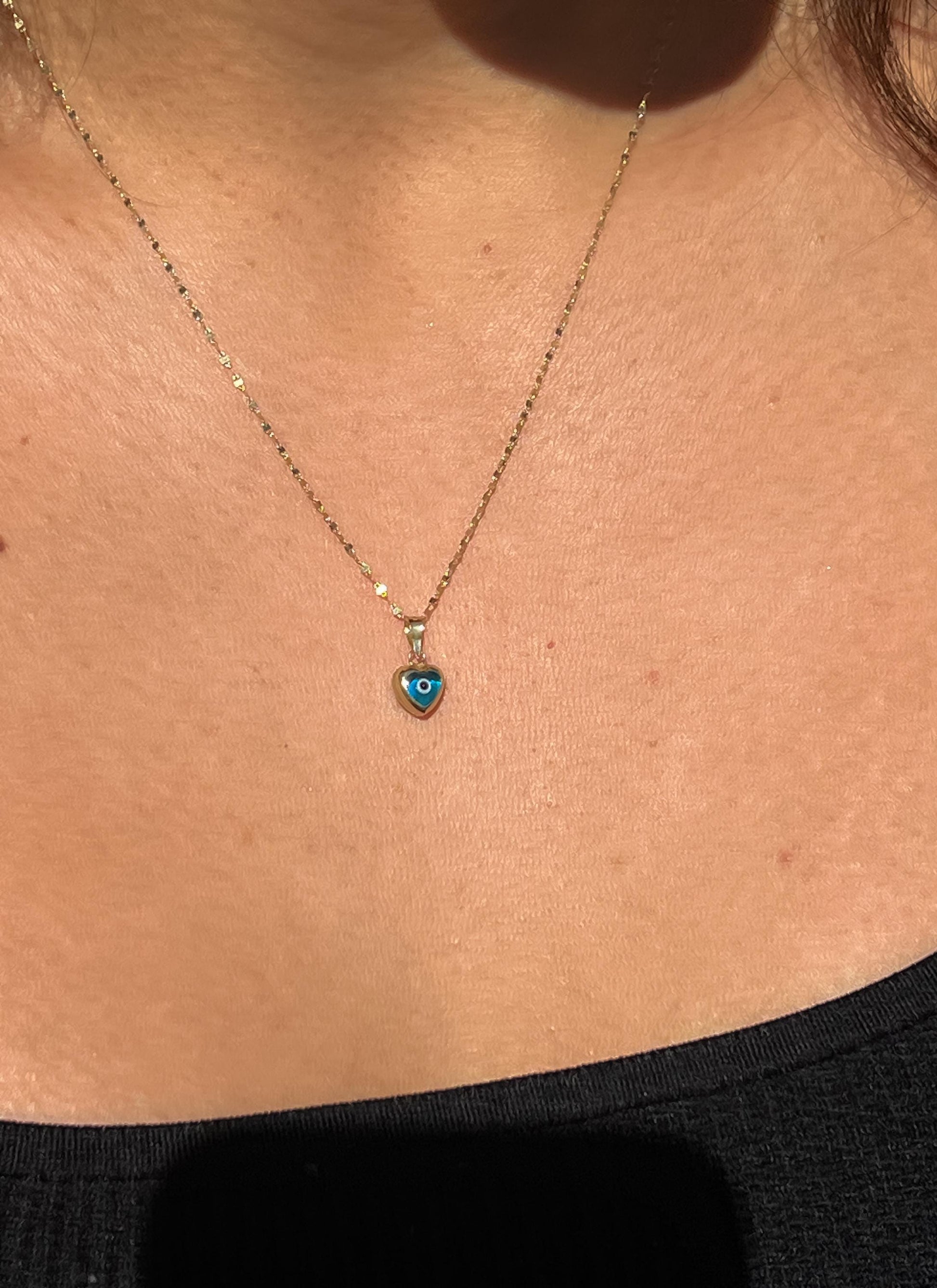 this heart evil eye pendant is weights approximately 0.40 grams very delicate and dainty