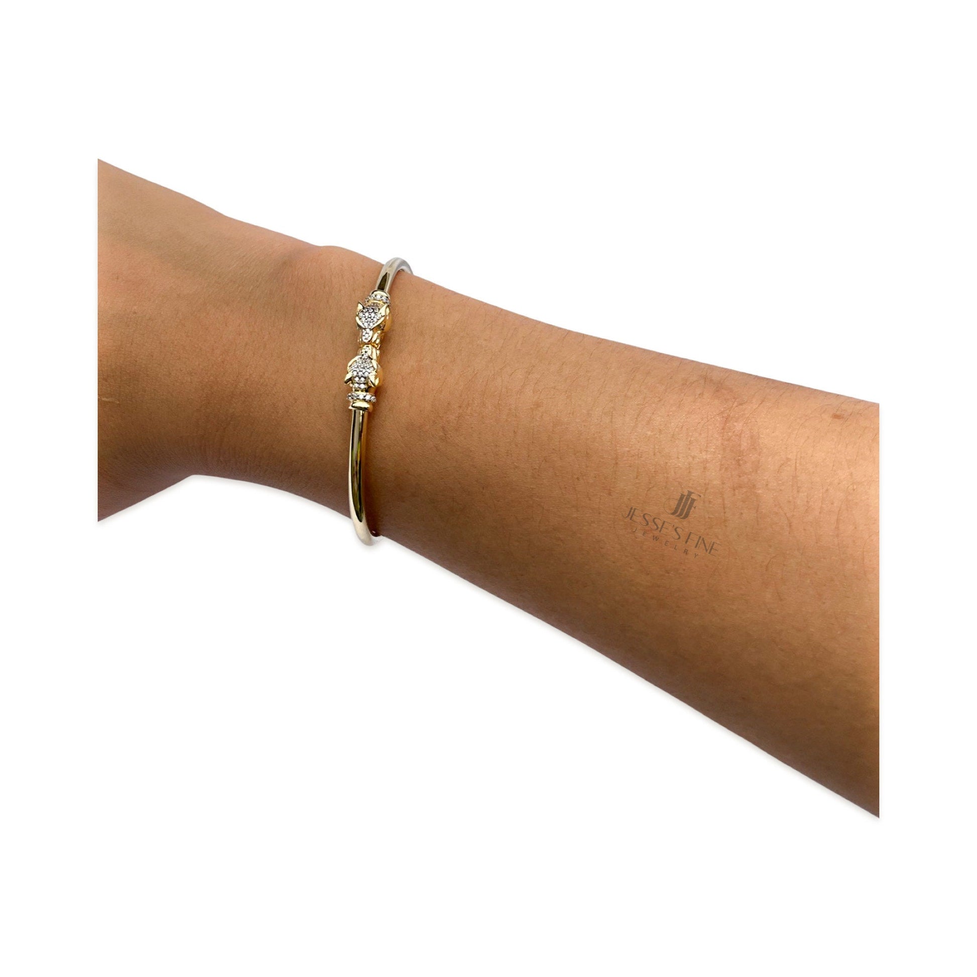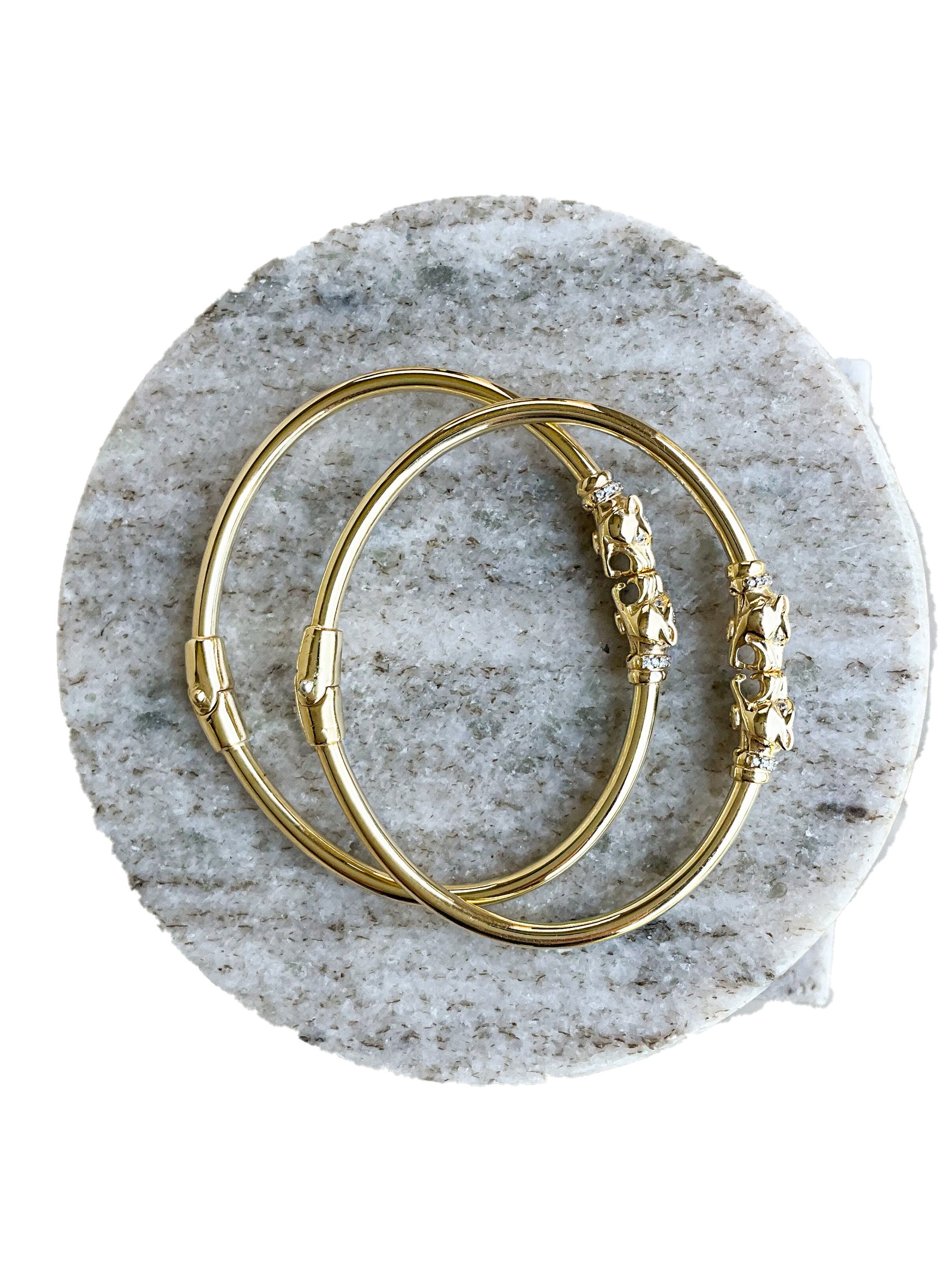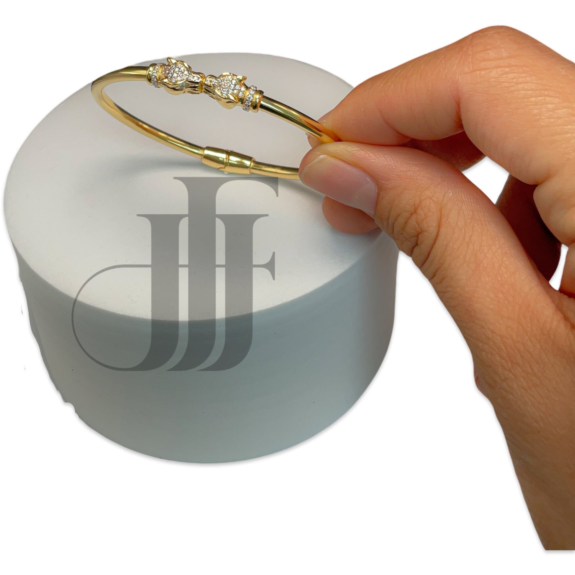Double panther head gold plated sterling silver cuff hinged bangle makes the perfect accessory for any outfit. This bangle is unisex This double panther bangle is sure to make a statement This is a fine crafted bangle comes packaged ready to be gifted for a special loved one This double panther cuff is gold plated sterling silver with cubic zicornia details