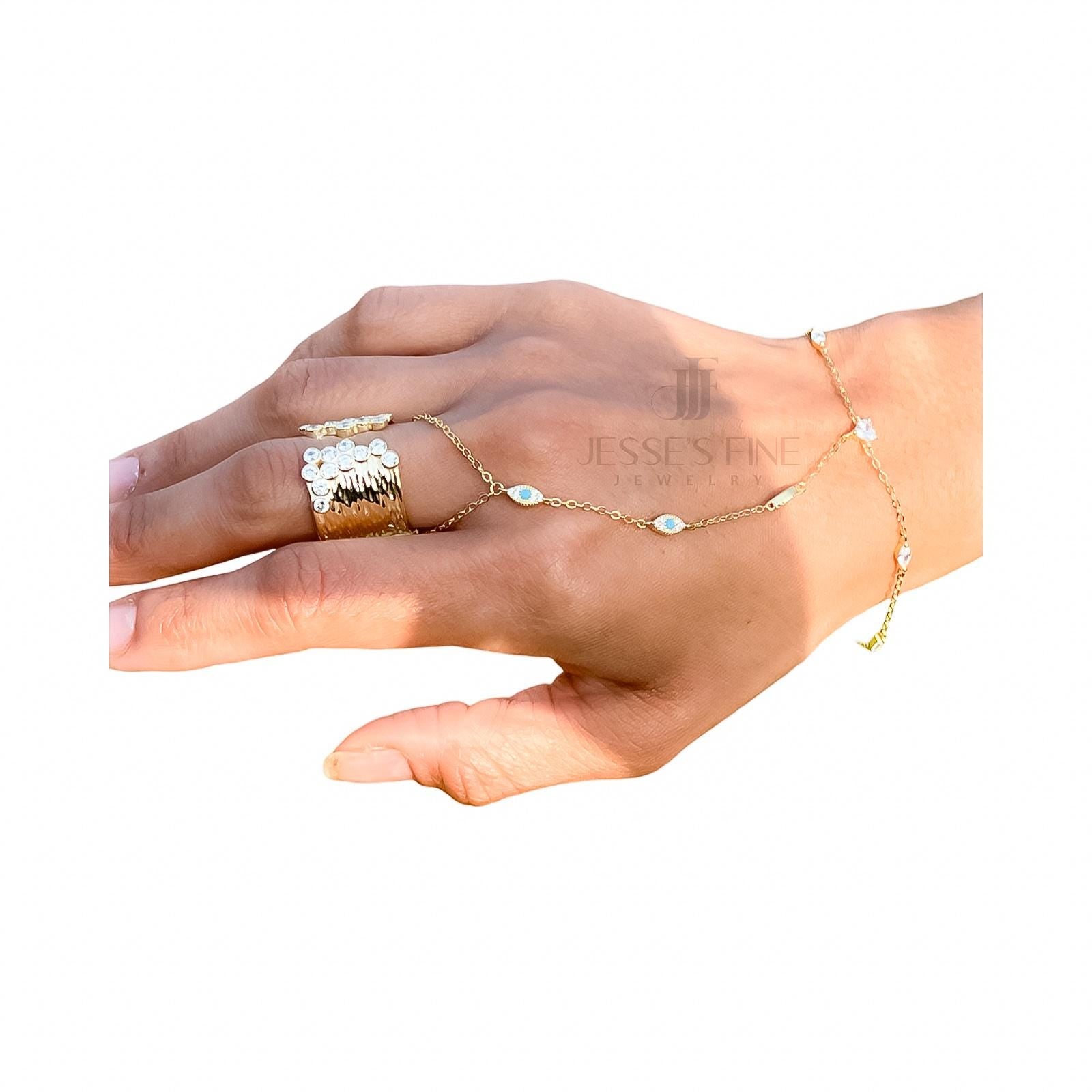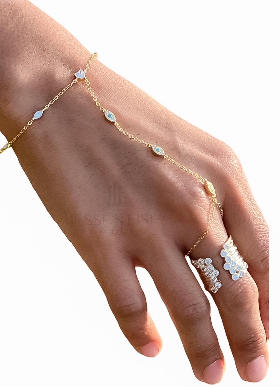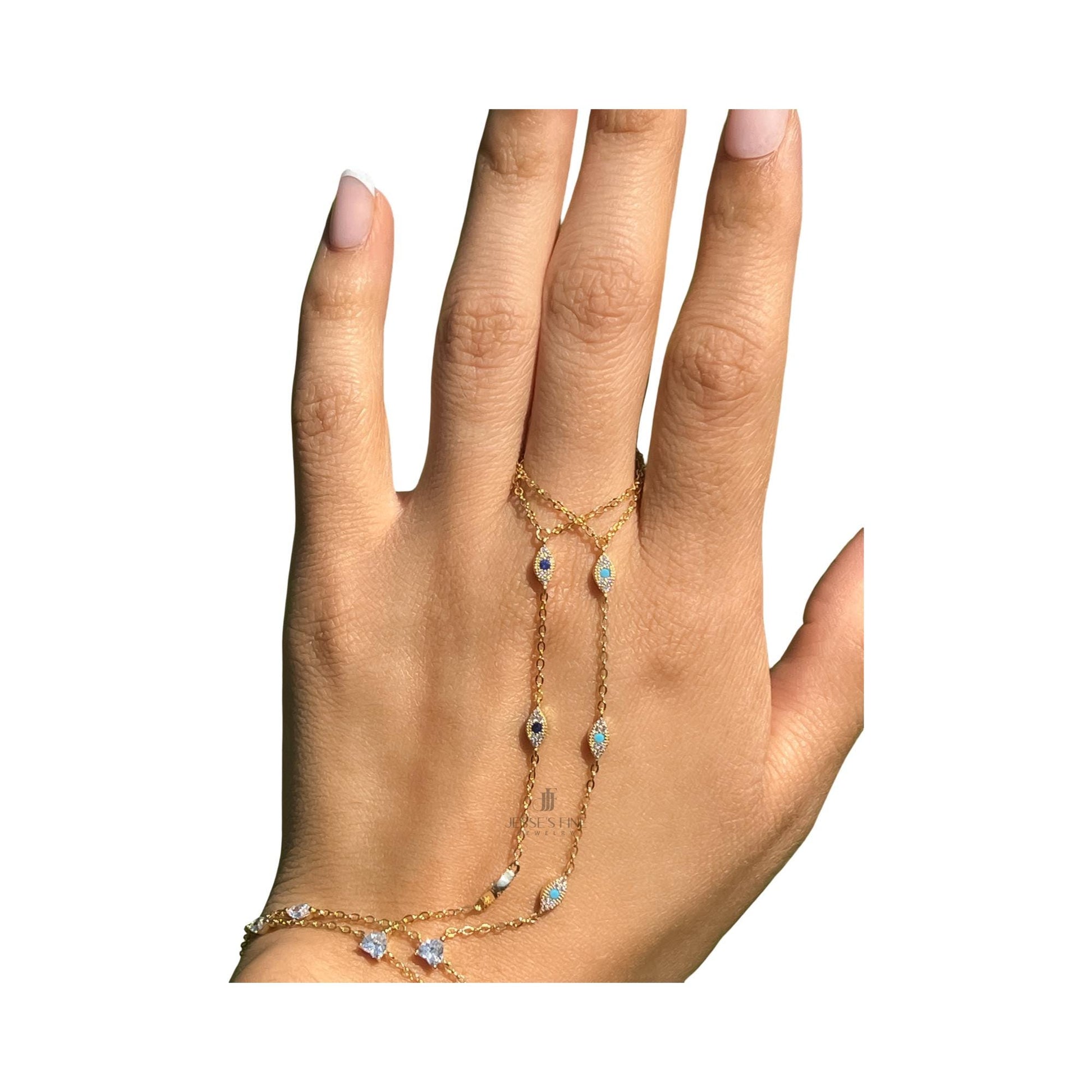 This dainty evil eye handchain comes in sterling silver or gold plated sterling silver