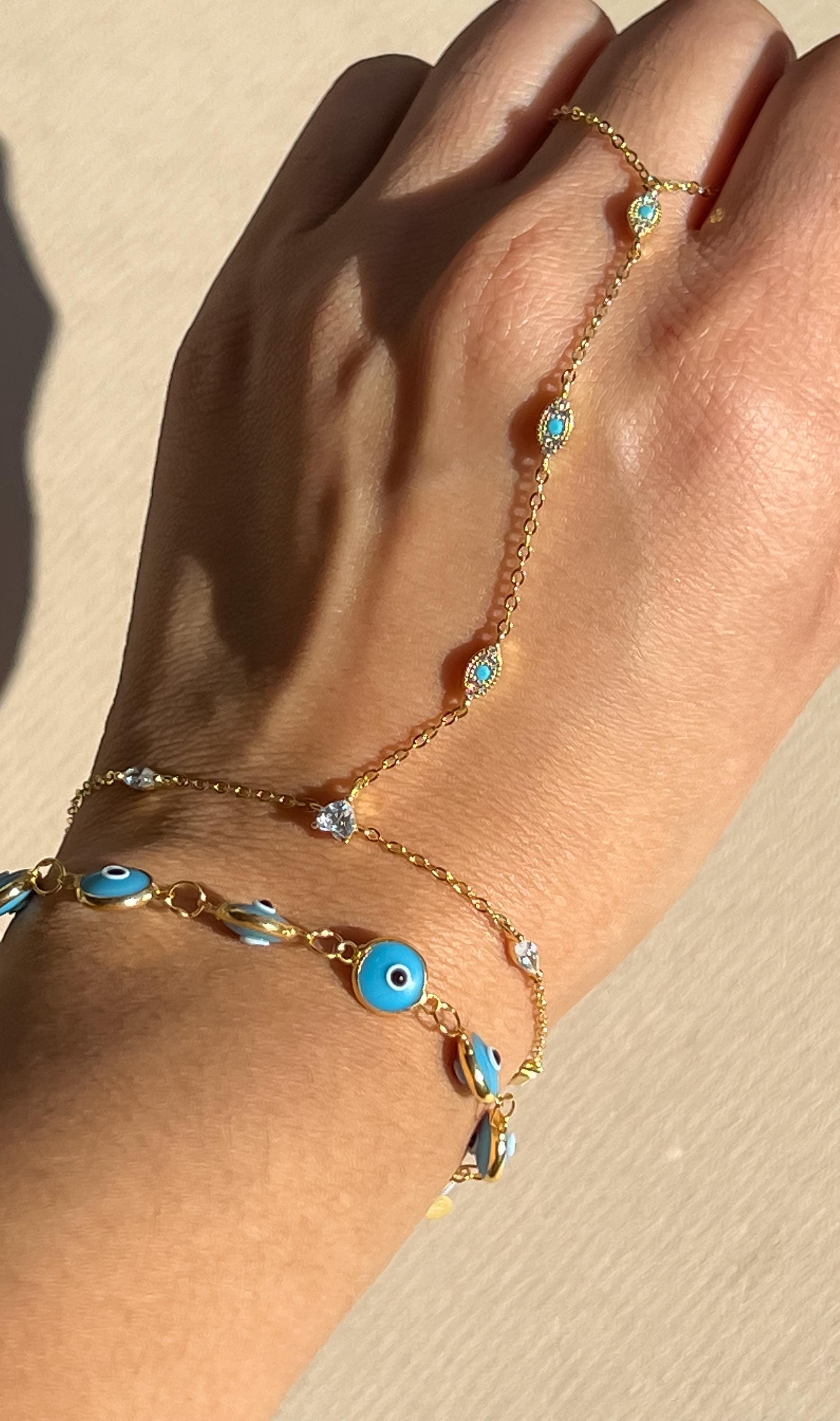 This dainty gold plated silver hand chain is adorned with evil eyes shapes and small turquoise stone