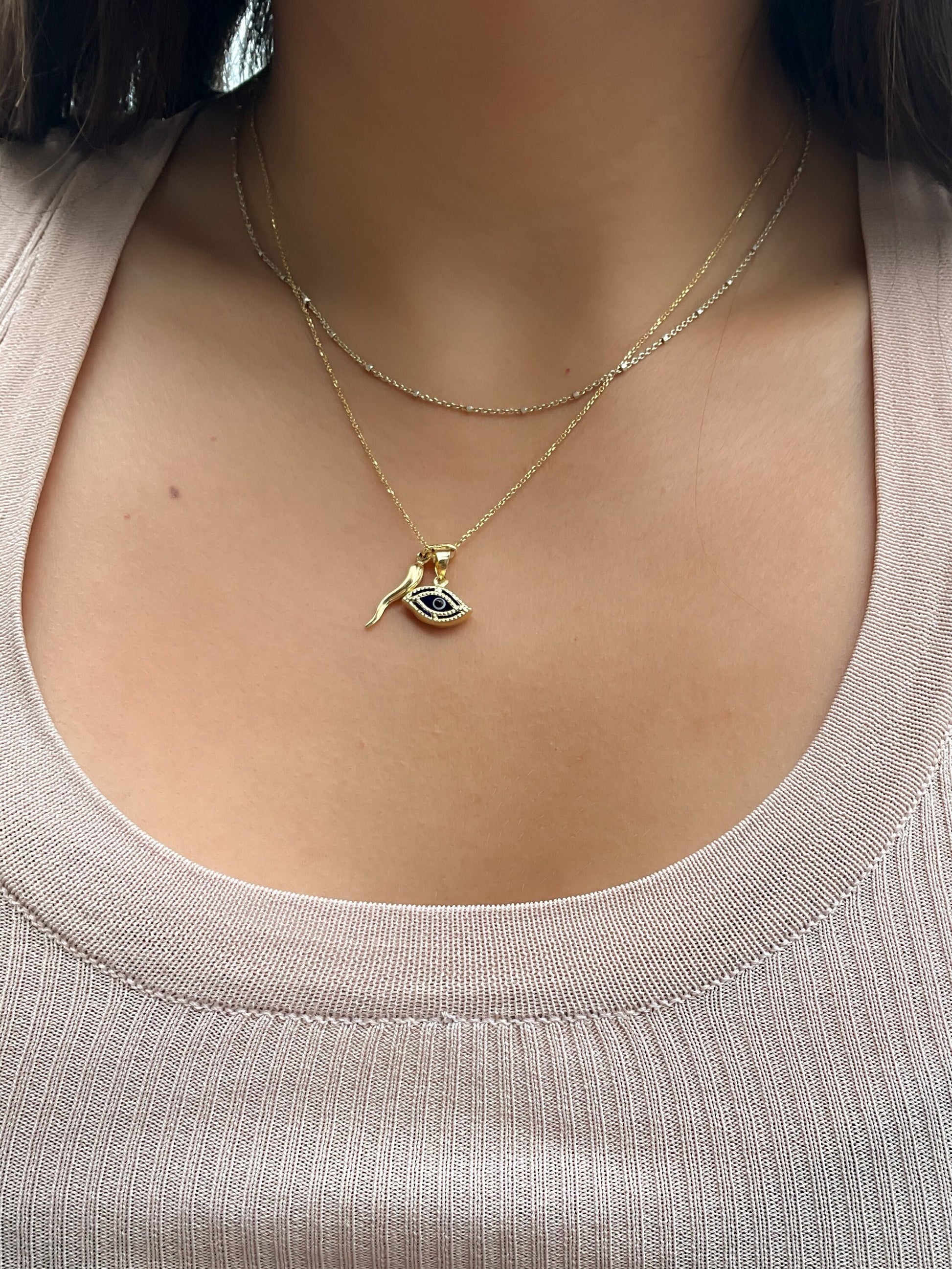 This 14K yellow gold evil eye pendant features a evil eye in the center.