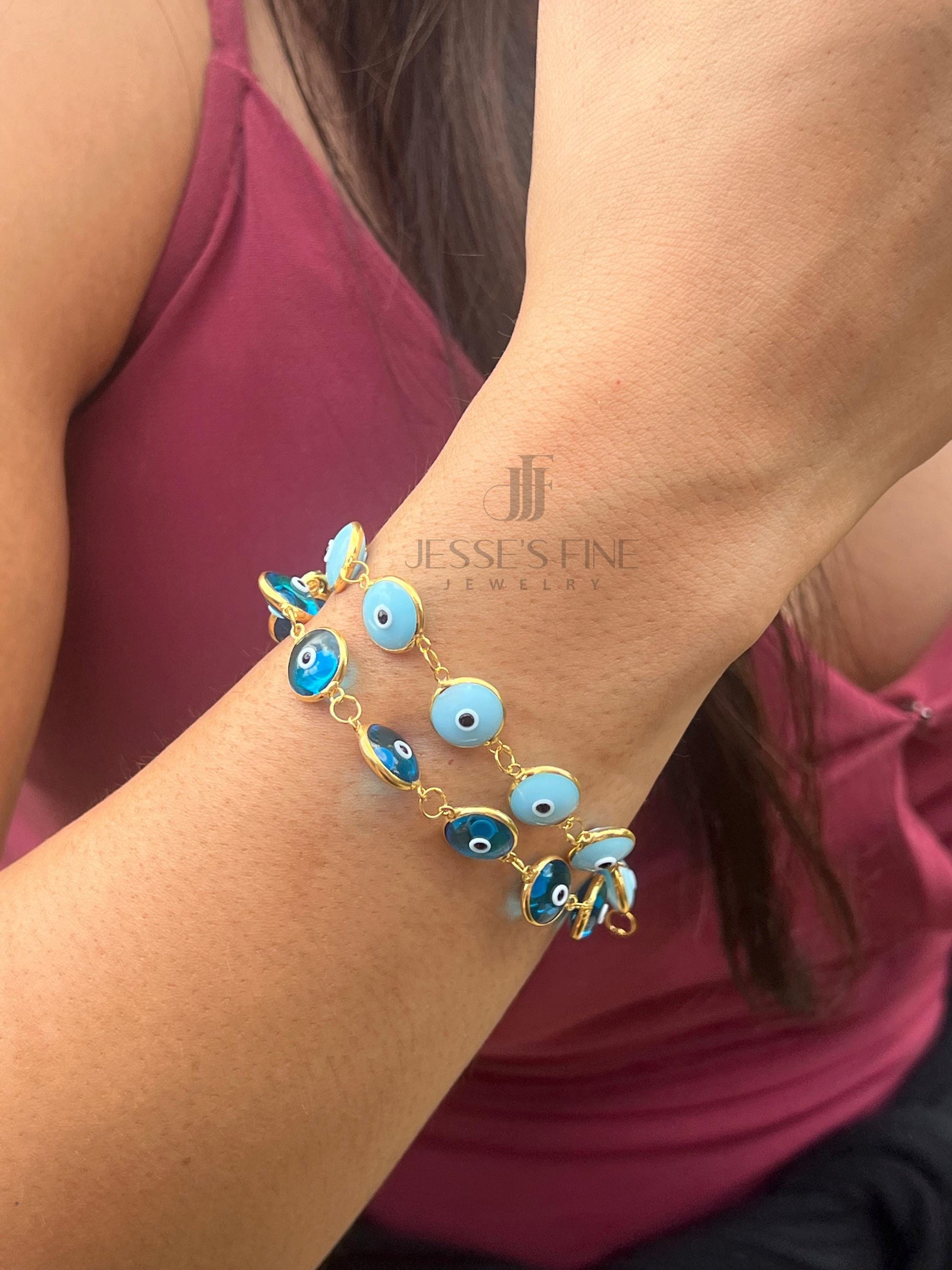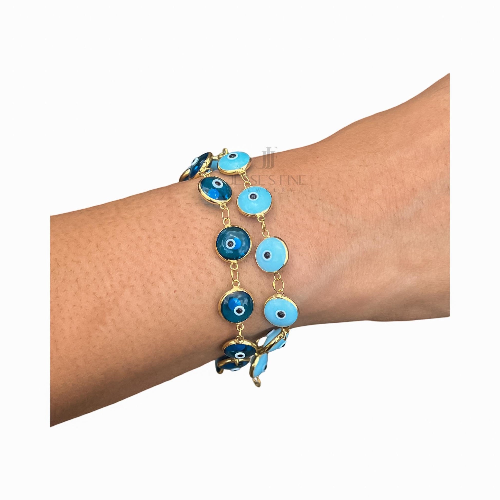 Gold plated sterling silver turquoise bezel evil eye bracelet This well crafted bezel evil eye tennis bracelet makes the perfect accessory for any event This evil eye tennis bracelet is can be about 6.5 in,7.25 in or 8 inches long The glass evil eyes are about 10 mm in size, each bracelet contains 11 evil eyes There are 3 different color options: light blue evil eye, blue evil eye and multi color evil eye This evil eye tennis bracelet comes packaged ready to be gifted
