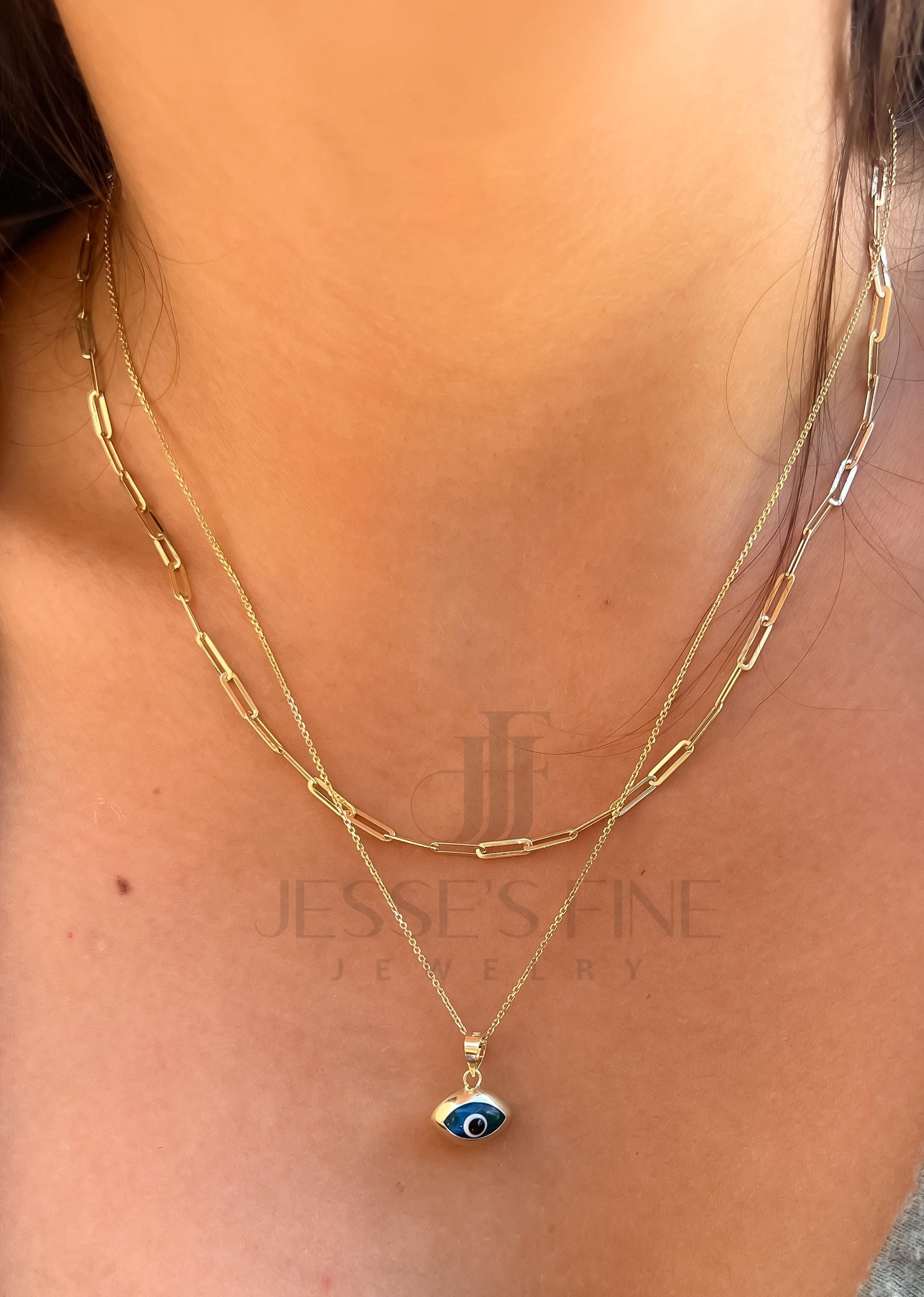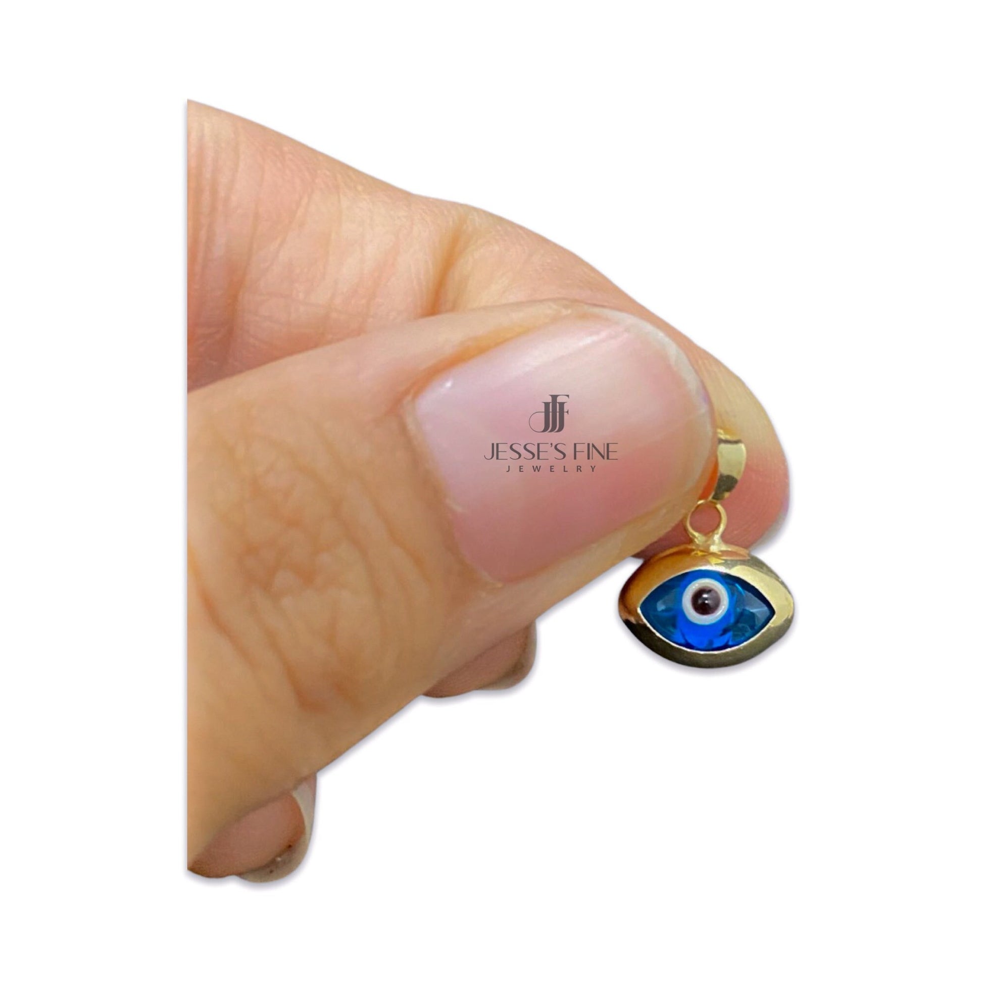 This dainty ocean blue eye shaped evil eye pendant makes the perfect accessory to any outfit This blue evil eye shaped pendant is perfect pendant to ward off the evil eye and provide protection This pendant comes packaged ready to be gifted This pendant is 14k yellow gold not plated or filled This pendant is approximately 0.8 grams eye shaped evil eye This pendant is approximately 11 mm in length and 8 mm in width