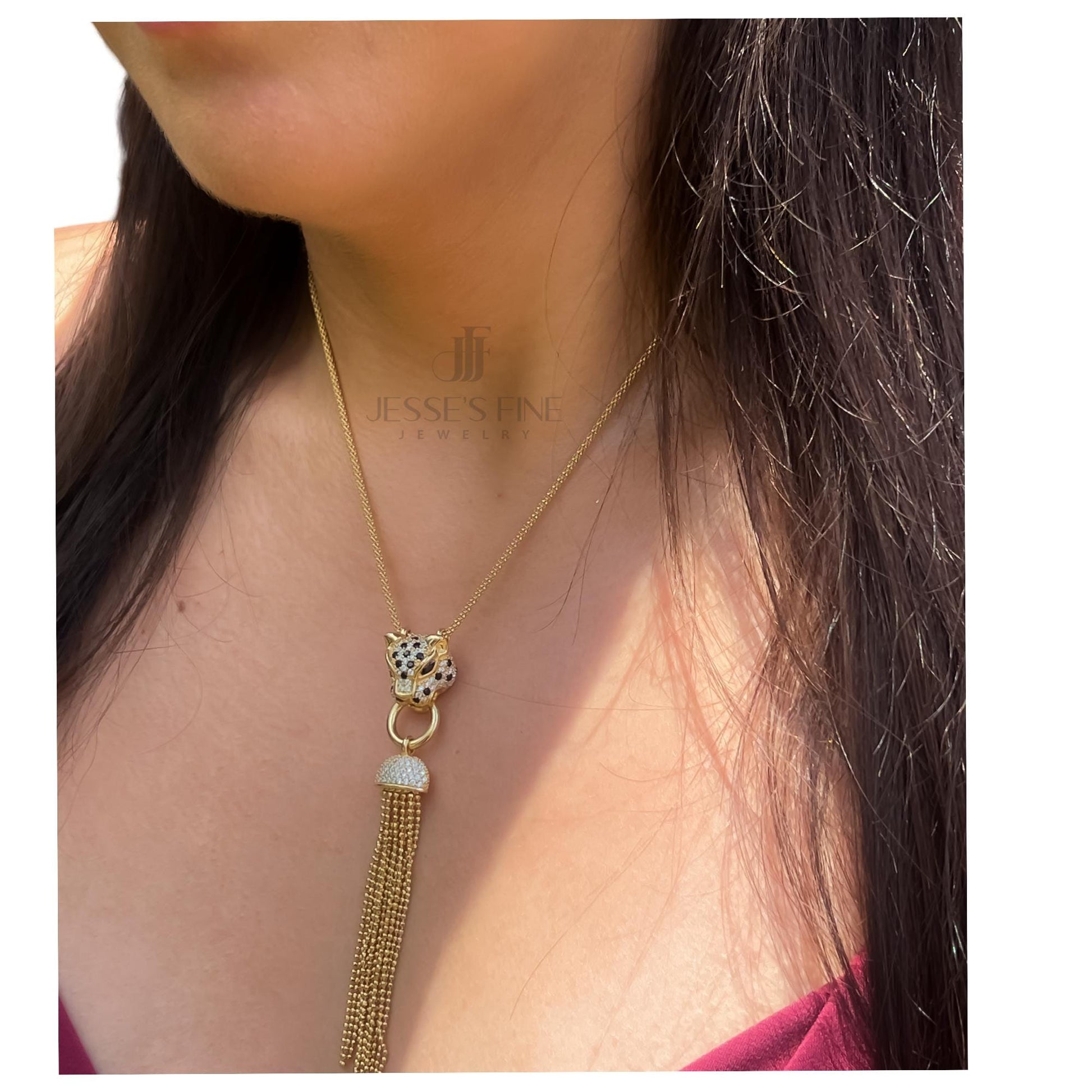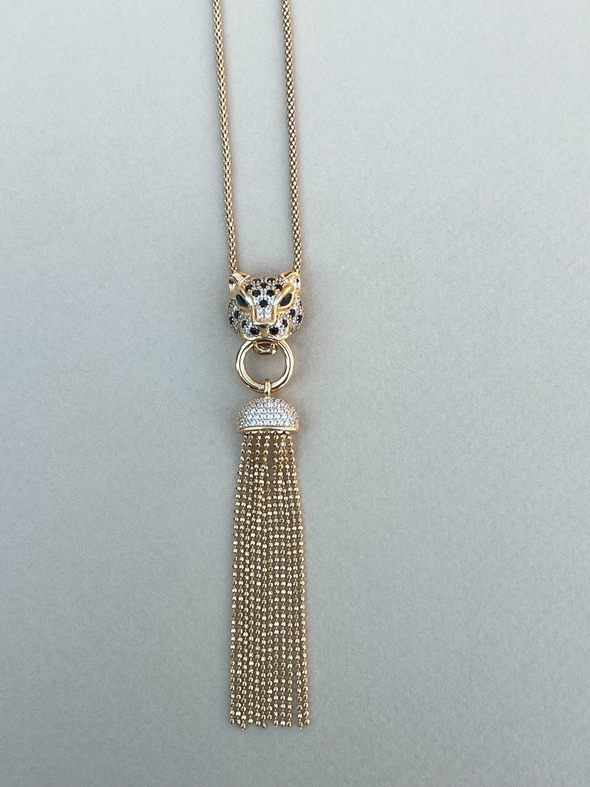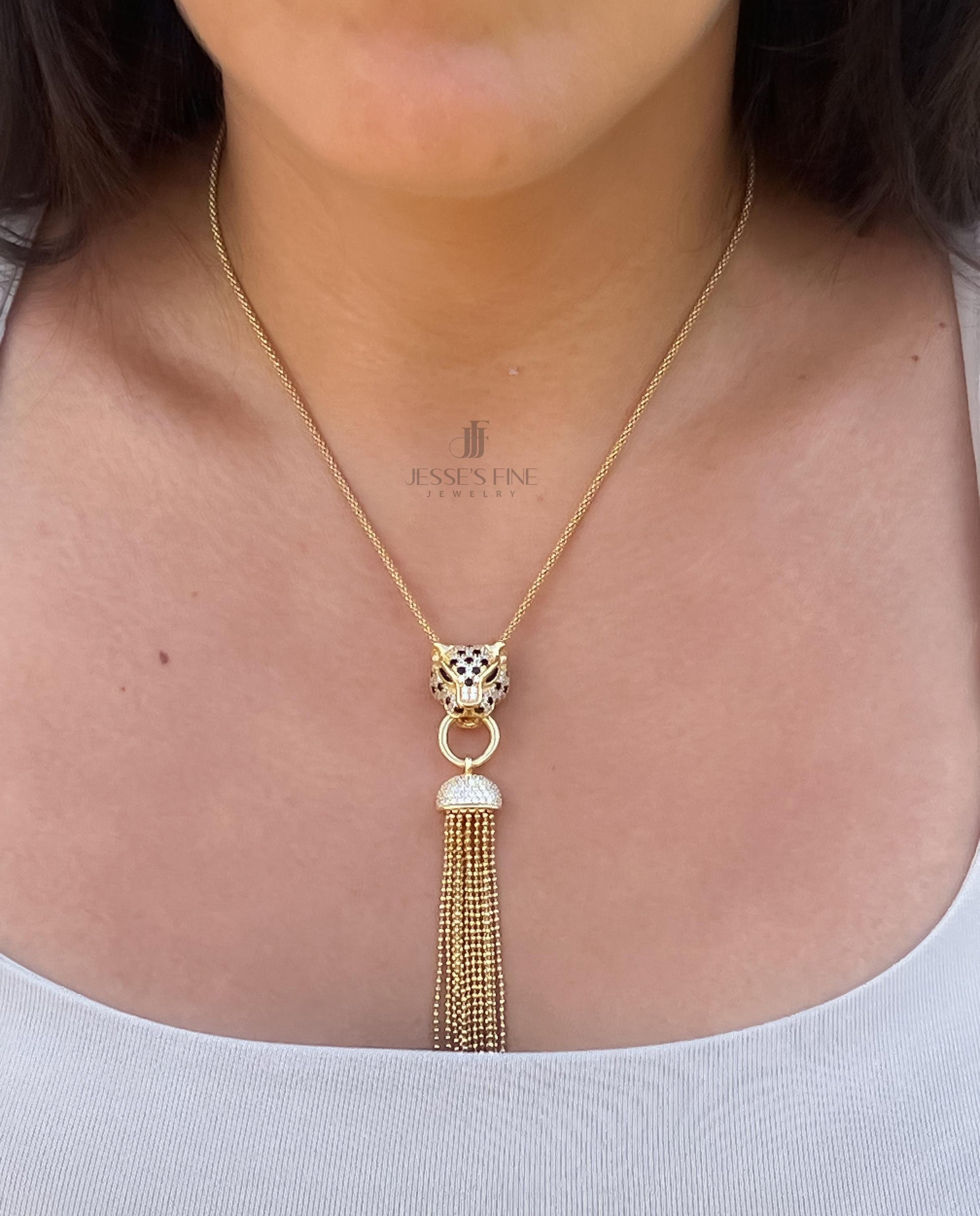 This well crafted jaguar necklace is sure to make a statement This jaguar necklace comes in silver or gold plated The necklace is 16 inches with 1 in extension The jaguar head is moveable in the necklace and is adorned with tassels that dangle This jaguar necklace comes packaged ready to be gifted The silver jaguar necklace is adorned with green cubic zirconia in the eyes The gold plated jaguar necklace is adorned with black cubic zicornia in the eyes This necklace is sterling silver