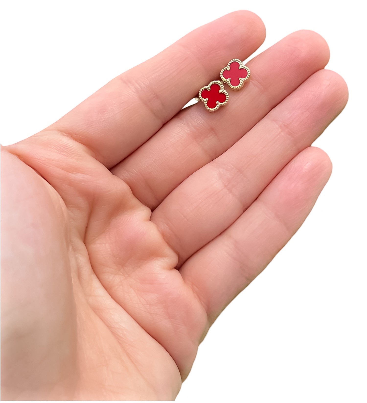 These mini clover earrings come in 3 colors: turquoise, red, light pink