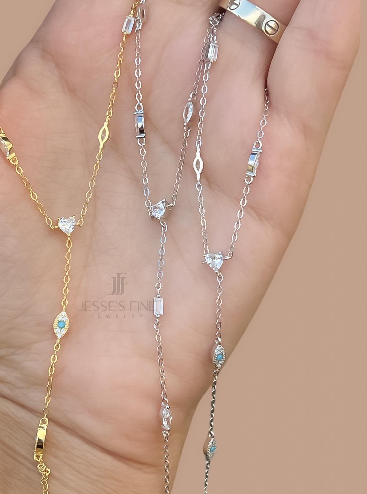 This dainty gold plated silver hand chain is adorned with evil eyes shapes and small turquoise stone A delicately placed heart is at the center of this hand chain This handchain is 6 inches and has an extra 2 inch extension
