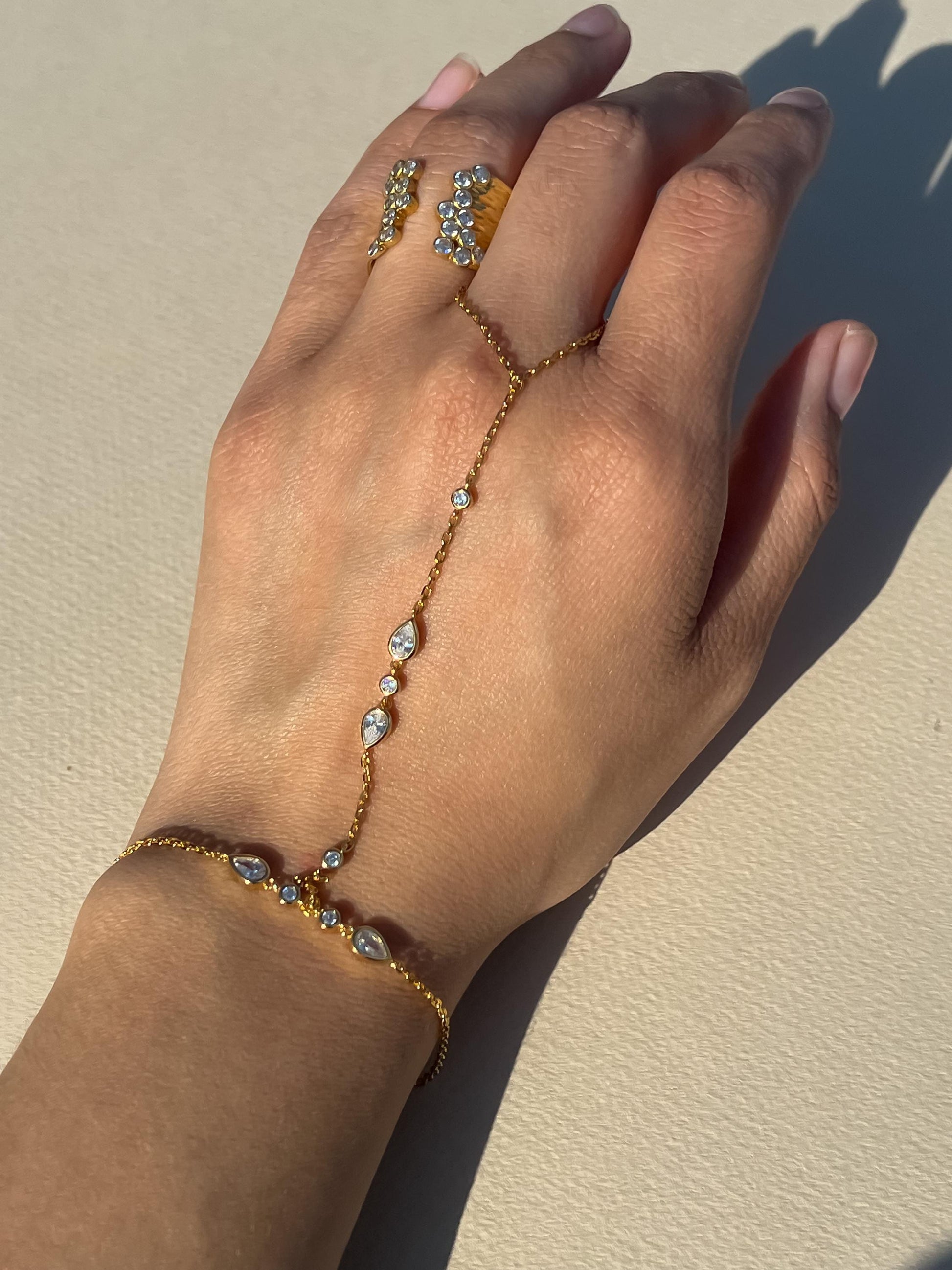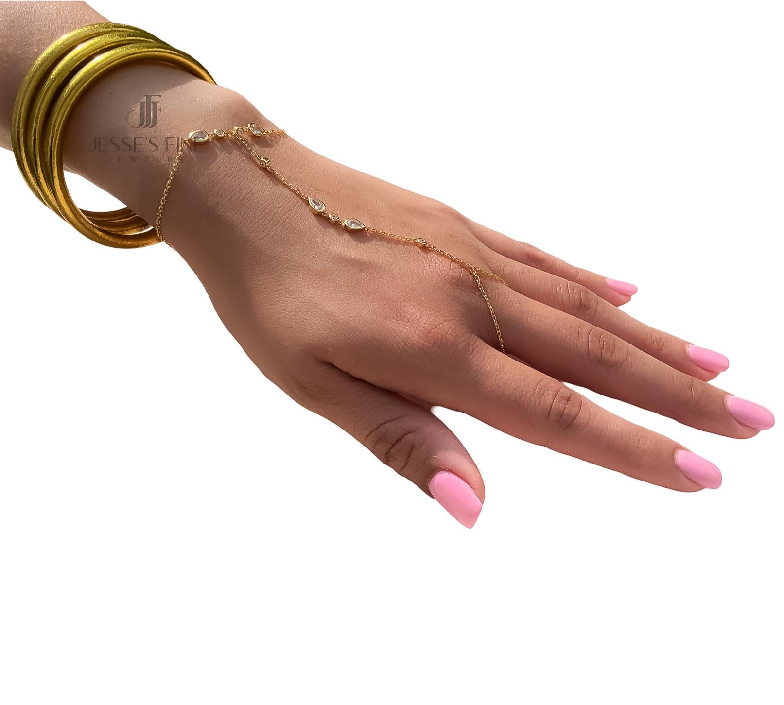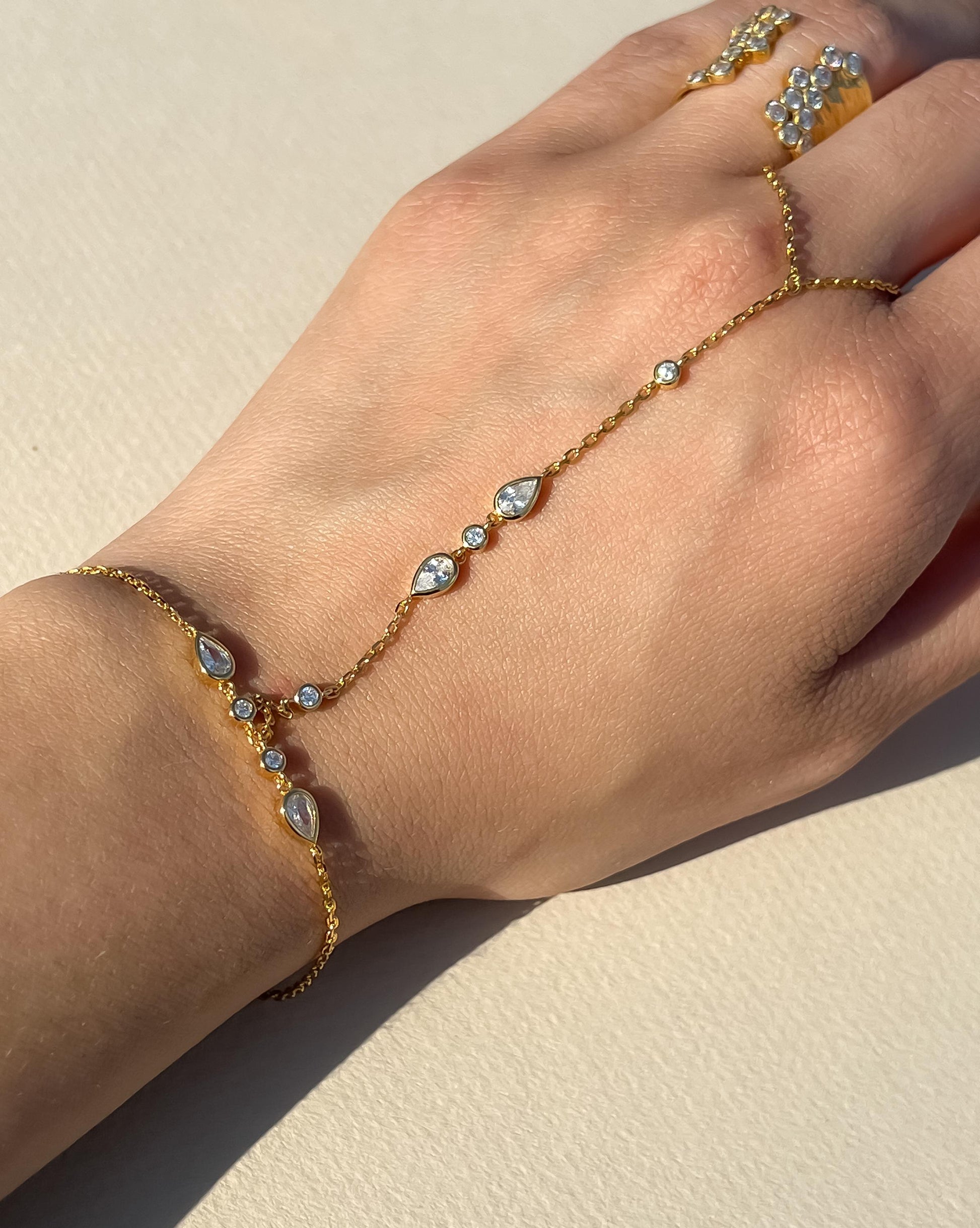 This dainty gold pear bezel handchain comes in sterling silver or gold plated sterling silver