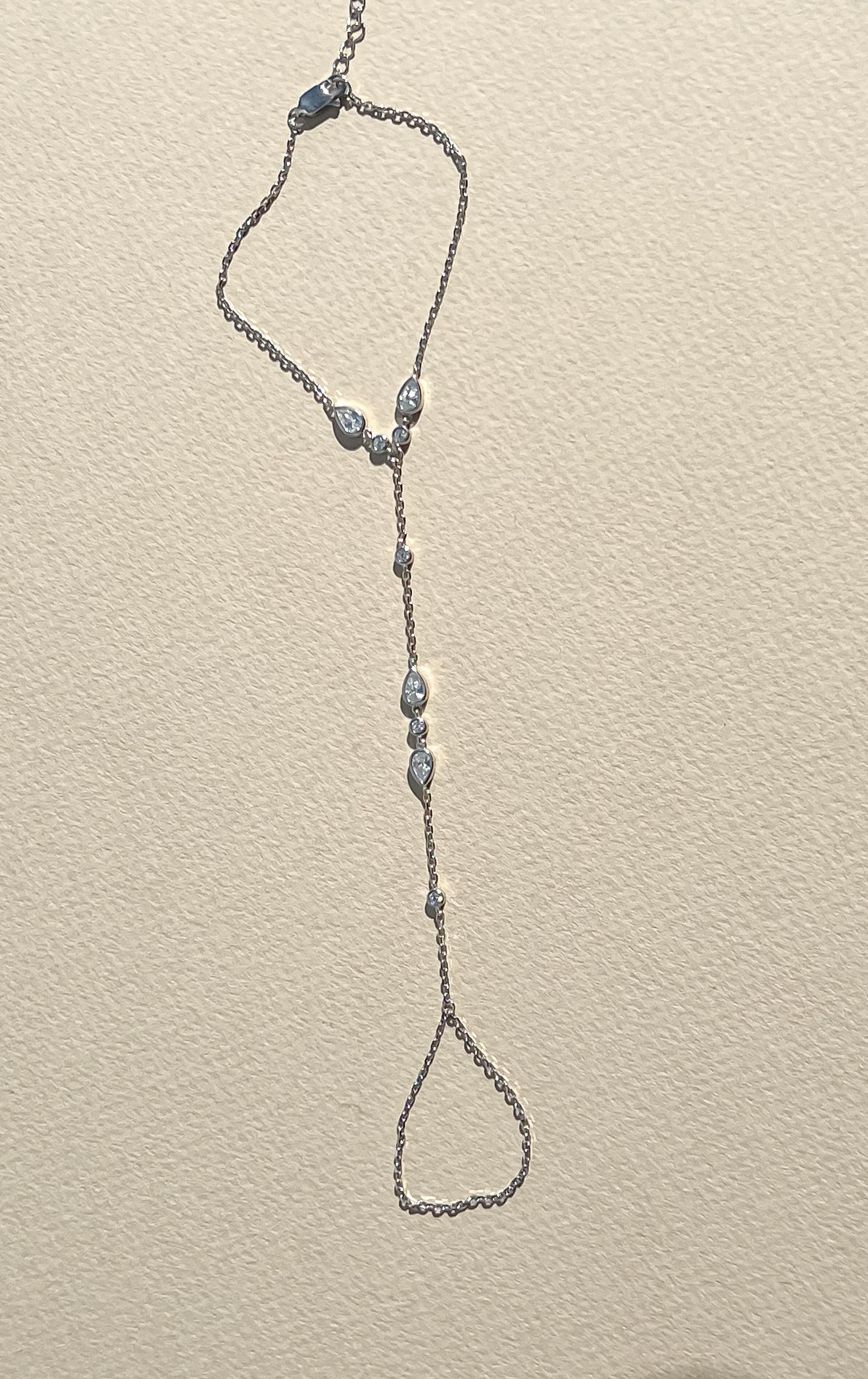 This dainty silver hand chain is adorned with pear shape bezel cubic zicornias and small round bezel stones