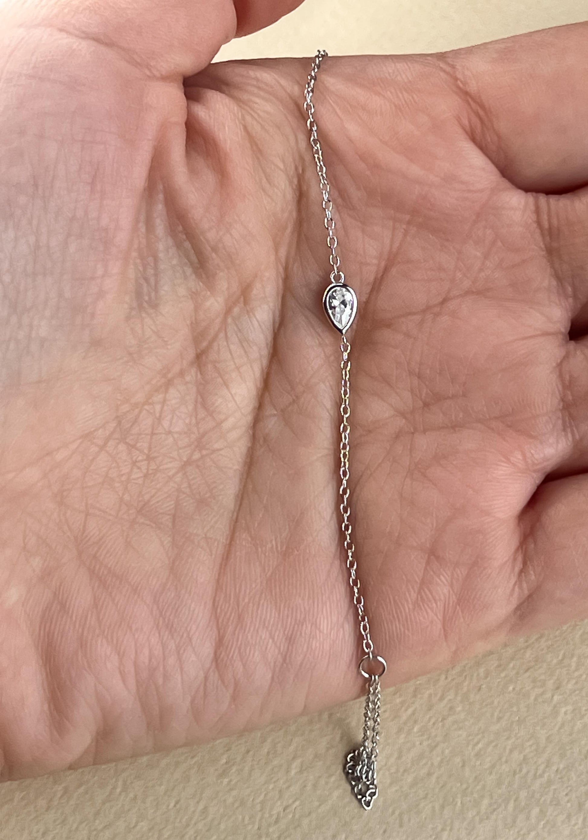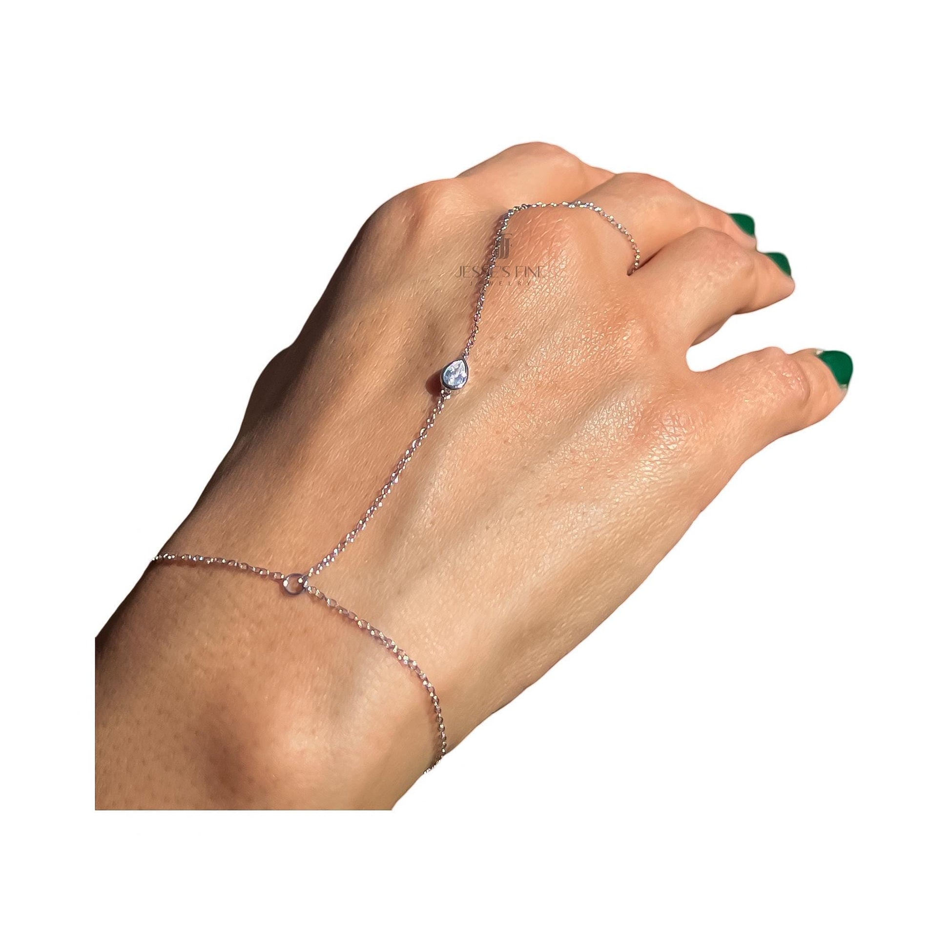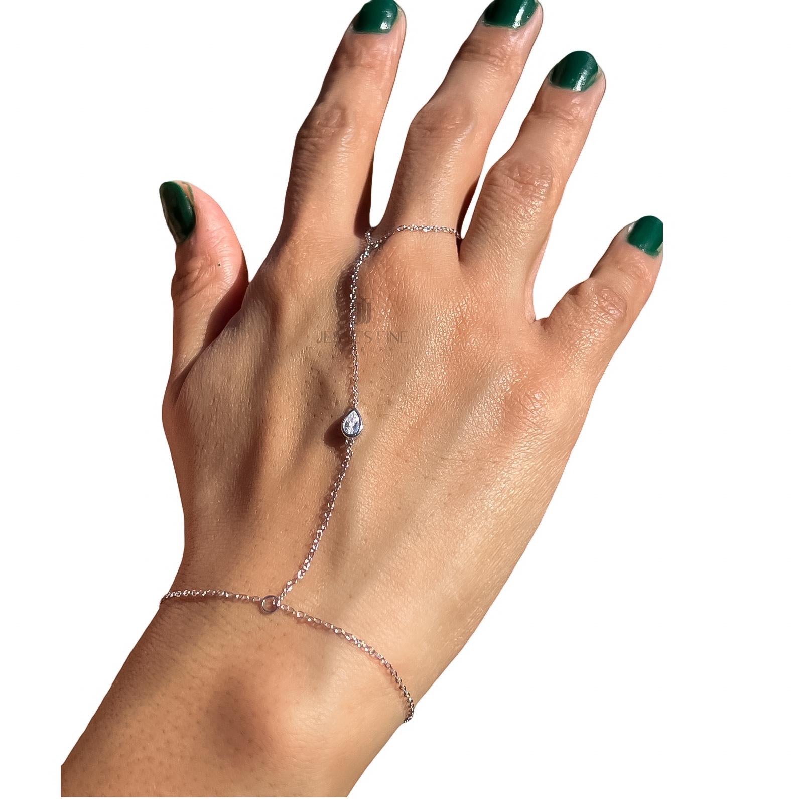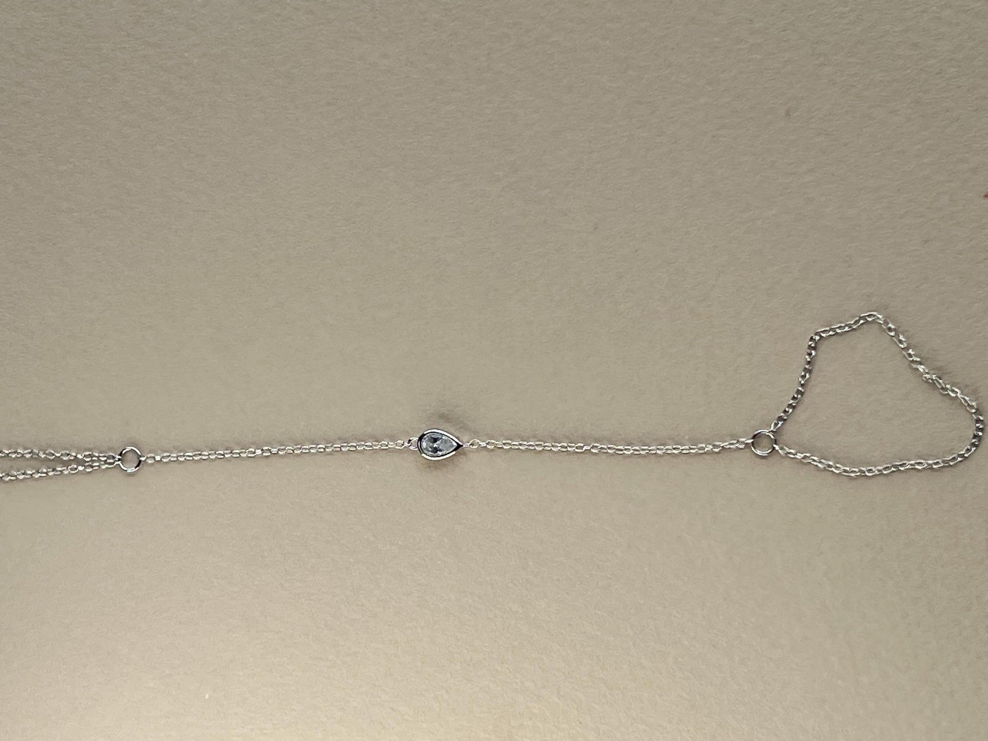 This dainty silver hand chain is adorned with one dainty bezel pear shape stone