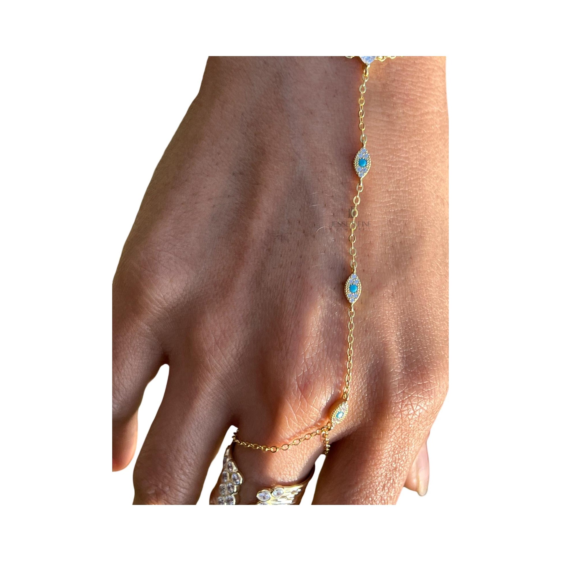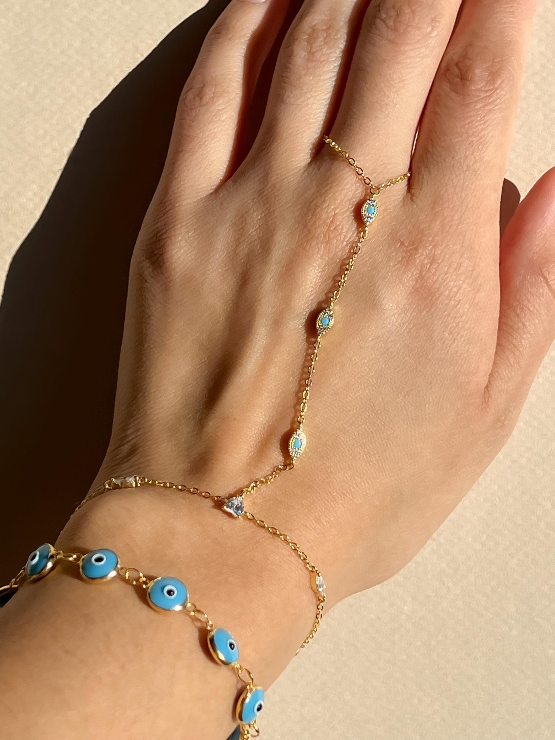 This dainty gold plated silver hand chain is adorned with evil eyes shapes and small turquoise stone